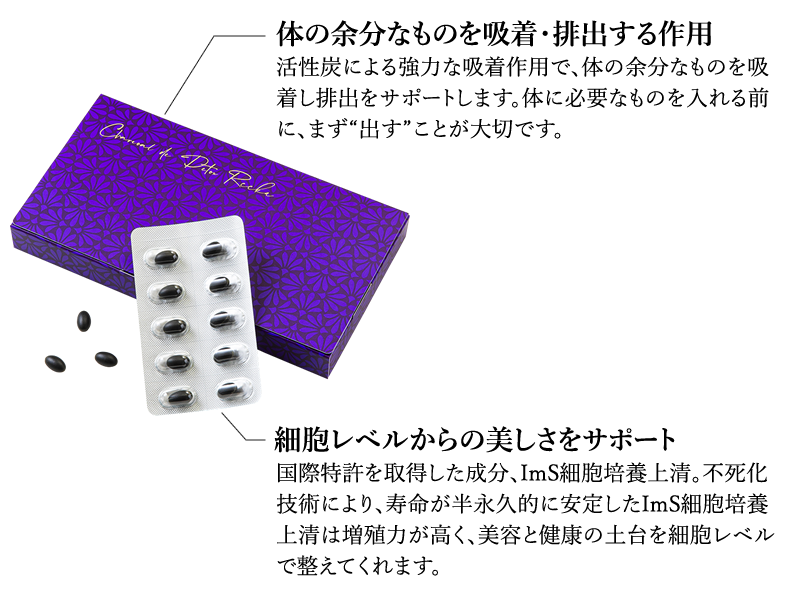 また、ヤシ殻活性炭・竹炭の特性である吸着作用を利用して体内にある老廃物や毒素を吸着し体外に排出することで腸内環境を整え、デトックス効果が期待できます。